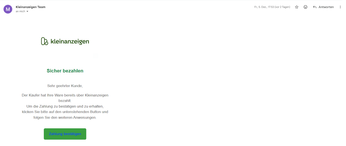 „Sicher bezahlen - Sehr geehrter Kunde, Der Käufer har Ihre Ware bereits über Kleinanzeigen bezahlt. Um die Zahlung zu bestätigen und zu erhalten, klicken Sie bitte auf den untenstehenden Button und folgen Sie weiteren Anweisungen. [Button Zahlung bestätigen].